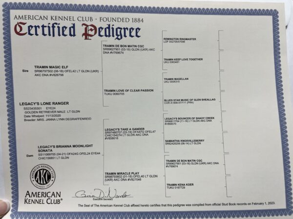Legacy’s Lone Ranger… Ranger came to our family as a puppy in an effort to bring new blood into our breeding that was comparable in quality to the Legacy line. This was a tall order! He has succeeded in doing just that as he successfully checked off all of his health certificates one by one with flying colors. Take a look at his pictures and you will see his stately beauty in every pose. He combines chiseled lines with graceful curves for the perfect male English Golden Retriever. Ranger’s personality has proven a match to his looks; he loves his family as well as everyone else he meets. We can’t wait to see what his offspring will look like when paired with our beautiful girls. Keep tuned for litters by this wonderful stud coming soon!